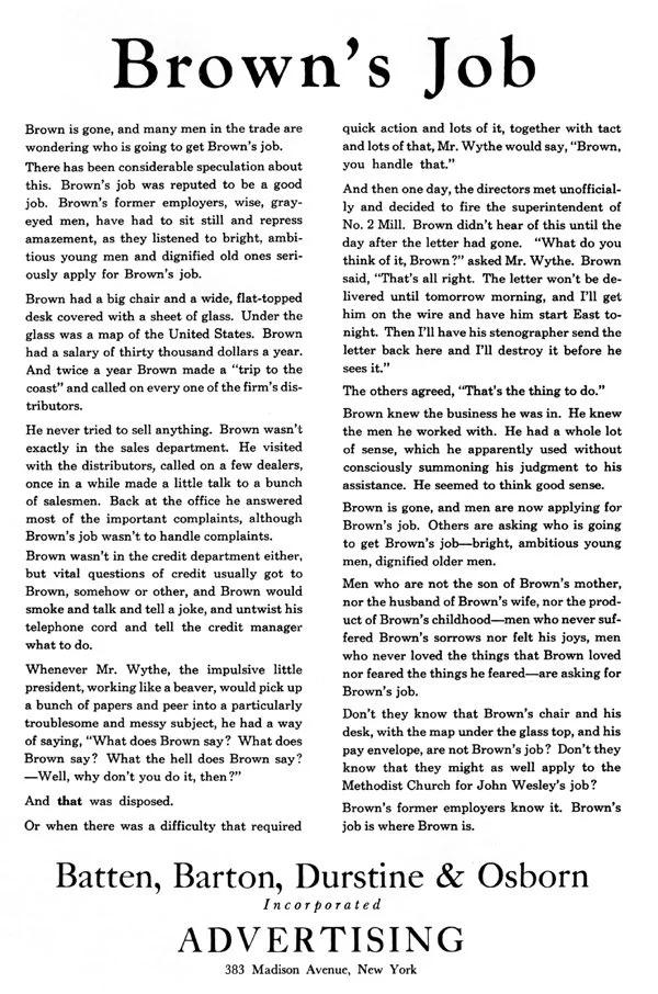 Lacking a product, selling proposition or even an obvious point, “Brown’s Job” is a chiding tale of a brilliant company man whose worth was never fully appreciated until his departure. It first appeared in the house newsletter of Batten, Barton, Durstine and Osborn (today’s BBDO).